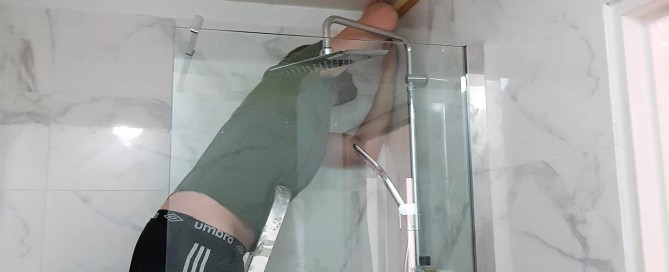 Installation d’un plafond tendu laqué blanc dans une salle de bain.